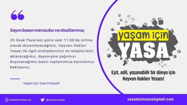 25 Ocak Pazartesi günü saat 11.00’da online olarak düzenleyeceğimiz, Hayvan Hakları Yasası ile ilgili endişelerimizi ve taleplerimizi aktaracağımız, dayanışma çağrımızı duyuracağımız basın toplantımıza katılımınızı bekliyoruz.