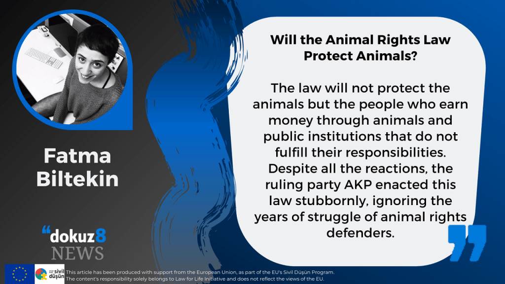 First of all, there is not even the definition of animal in the law, whereas according to the recommendation report by the Parliament’s Animal Rights Research Commission, it was recommended to define animals as sentient beings; but this article did not find a place in the law like the other recommendations of the commission. In other words, AKP deputies are misinforming the public when they state that “animals are not property but living beings”.