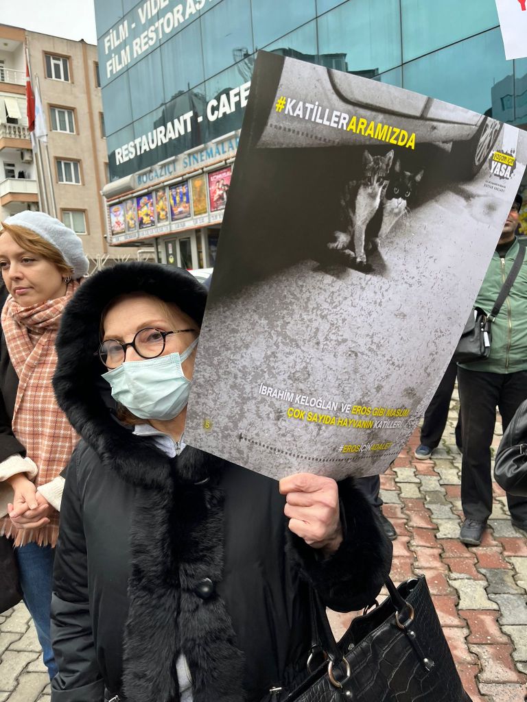 Eylemde söz alan Sarıyer Gönüllüleri’nden Yağmur Üstündağ da, geçtiğimiz günlerde yatarı olmayan bir hapis cezasıyla serbest bırakılan İbrahim Keloğlan’ın işkenceyle öldürdüğü Eros adına yaptığı konuşmayı “Bizi affetme Eros, sesini duyuramadığımız, sesi olamadığımız tüm masum canlarımız bizleri affetmeyin!” diyerek bitirdi.