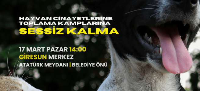 17 Mart Pazar saat 14:00'te, Atatürk Meydanı'nda (Belediye Önü) bu kez Karadeniz sokaklarında haykıracağız: “Hayvana, insana, yeryüzüne özgürlük!” Düdüğün, ailen, pankartın, sloganların, mücadele azmin, arkadaşların, umudun ile eyleme gel.