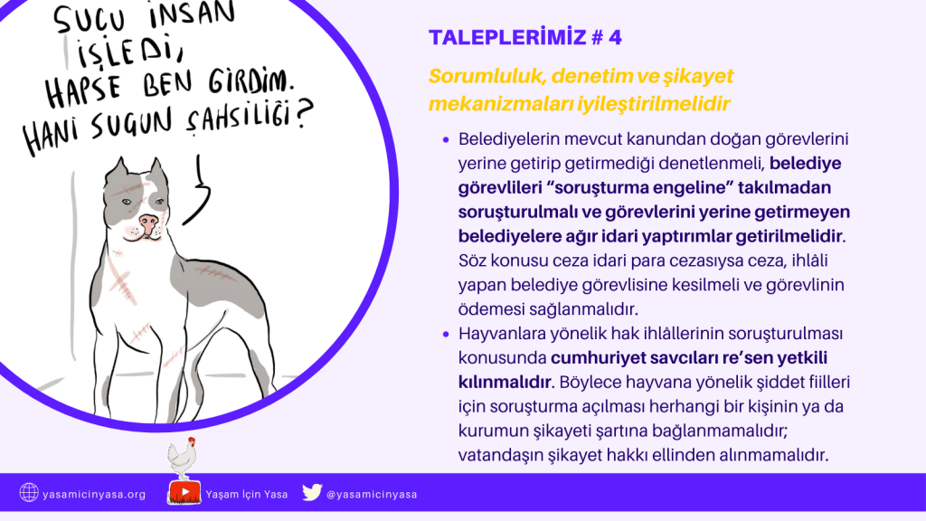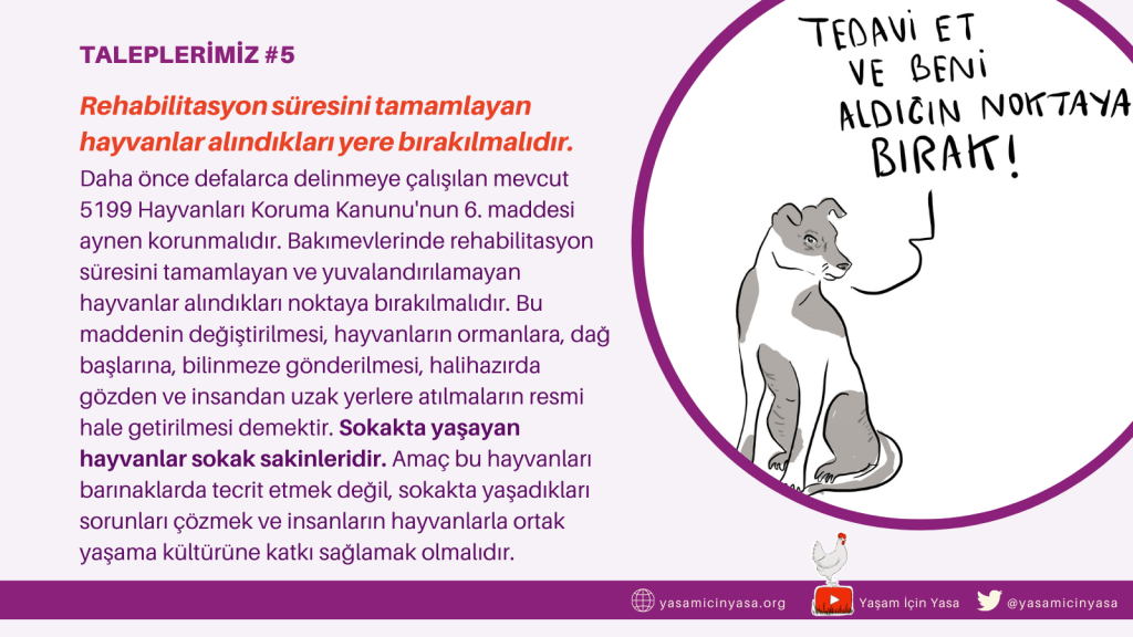 Hayvan Hakları Yasası’nın çıkması ve mevcut 5199 sayılı Hayvanları Koruma Kanunu’nun kapsamının genişletilerek tür ayrımı yapmaksızın hayvanlar lehine değiştirilmesi için diğer talep görsellerimize bu bağlantıdan erişebilir, sosyal medyada paylaşabilirsiniz.