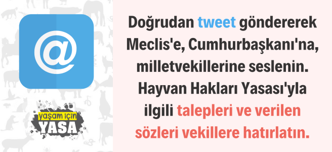 Sn. @ilhamiOzcanAygn, TBMM’de bize “Dilerim mücadele ettiğiniz gibi bir Hayvan Hakları Yasası çıkar. Çıkmazsa mücadelenizde biz de yanınızdayız” demiştiniz. AKP yasa teklifi Meclis’e geldiğinde #yaşamiçinyasa taleplerimize desteğinizi bekliyoruz. https://yasamicinyasa.wordpress.com/taleplerimiz