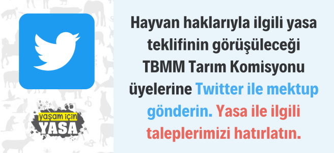 Aşağıdaki her tweeti tek bir tıklamayla göndererek; Meclis Hayvan Hakları Arş. Kom.’nun tavsiyelerini, hayvanseverlerin ve hak savunucularının taleplerini içeren mektubu